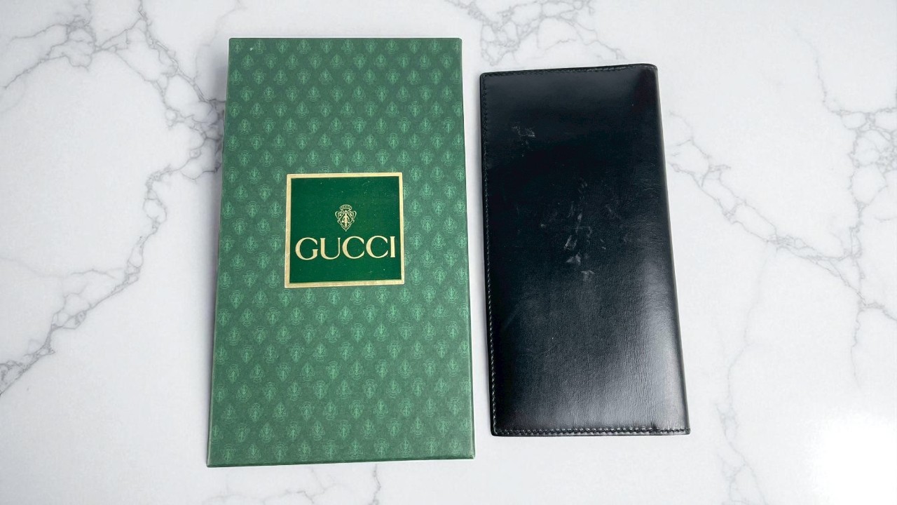 GUCCI グッチ 二つ折り 長財布 金具 プレート レザー ブラック を出張買取